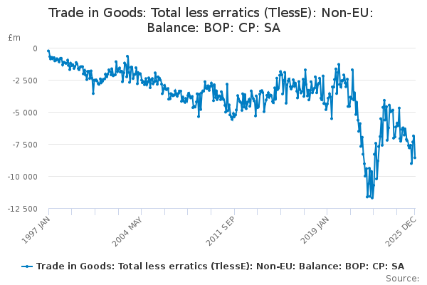 Download this time seriesTrade in Goods: Total less erratics (TlessE): Non-EU: Balance: BOP: CP: SA