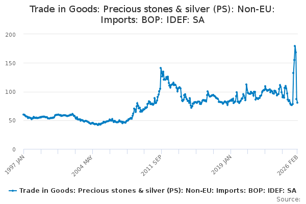 Download this time seriesTrade in Goods: Precious stones & silver (PS): Non-EU: Imports: BOP: IDEF: SA