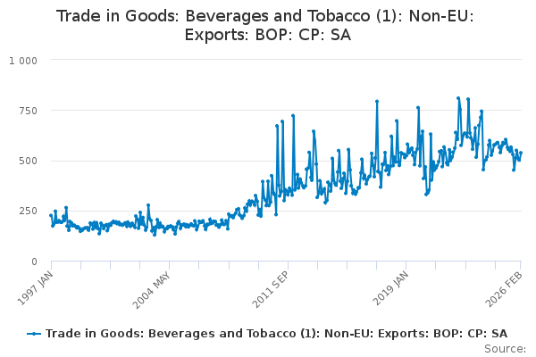 Download this time seriesTrade in Goods: Beverages and Tobacco (1): Non-EU: Exports: BOP: CP: SA