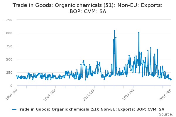 Download this time seriesTrade in Goods: Organic chemicals (51): Non-EU: Exports: BOP: CVM: SA