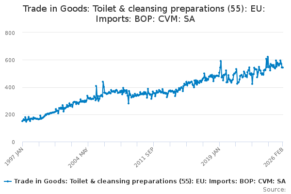 Download this time seriesTrade in Goods: Toilet & cleansing preparations (55): EU: Imports: BOP: CVM: SA