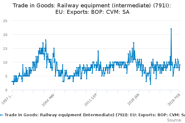 Download this time seriesTrade in Goods: Railway equipment (intermediate) (791I): EU: Exports: BOP: CVM: SA