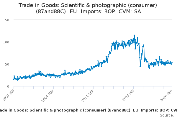 Download this time seriesTrade in Goods: Scientific & photographic (consumer) (87and88C): EU: Imports: BOP: CVM: SA