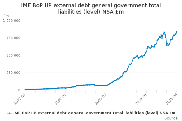 Download this time seriesIMF BoP IIP external debt general government total liabilities (level) NSA £m