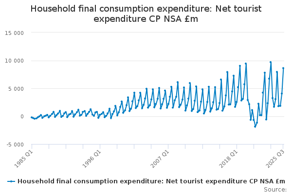 Download this time seriesHousehold final consumption expenditure: Net tourist expenditure CP NSA £m
