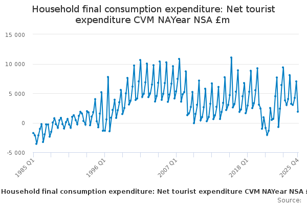 Download this time seriesHousehold final consumption expenditure: Net tourist expenditure CVM NAYear NSA £m