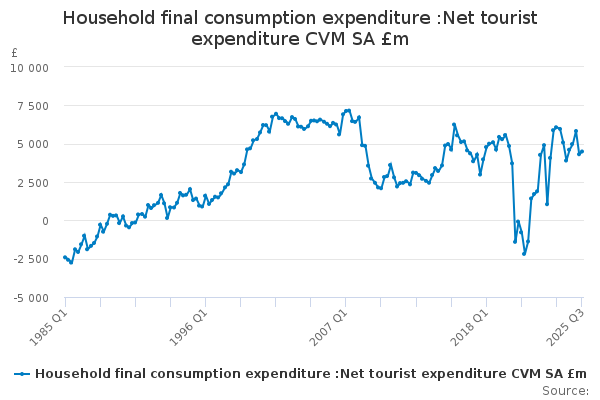 Download this time seriesHousehold final consumption expenditure :Net tourist expenditure CVM SA £m
