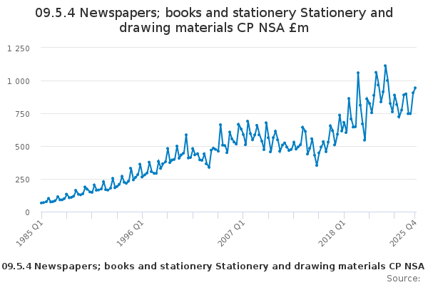 Download this time series09.5.4 Newspapers; books and stationery Stationery and drawing materials CP NSA £m
