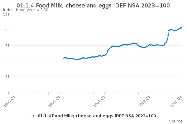 Download this time series01.1.4 Food Milk; cheese and eggs IDEF NSA 2023=100