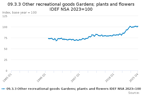 Download this time series09.3.3 Other recreational goods Gardens; plants and flowers IDEF NSA 2023=100