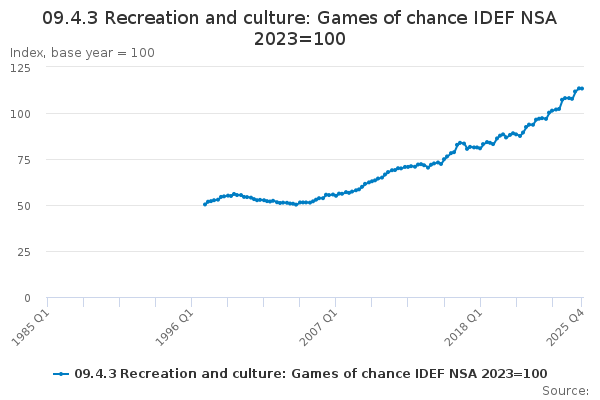 Download this time series09.4.3 Recreation and culture: Games of chance IDEF NSA 2023=100