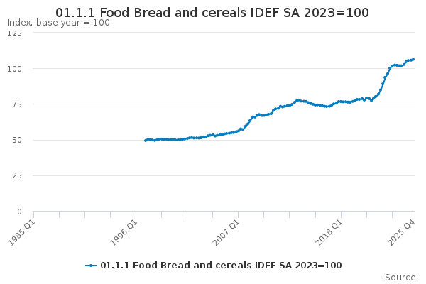 Download this time series01.1.1 Food Bread and cereals IDEF SA 2023=100