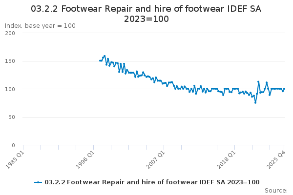 Download this time series03.2.2 Footwear Repair and hire of footwear IDEF SA 2023=100