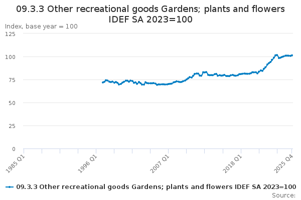 Download this time series09.3.3 Other recreational goods Gardens; plants and flowers IDEF SA 2023=100