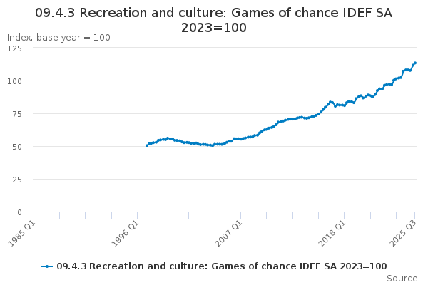 Download this time series09.4.3 Recreation and culture: Games of chance IDEF SA 2023=100