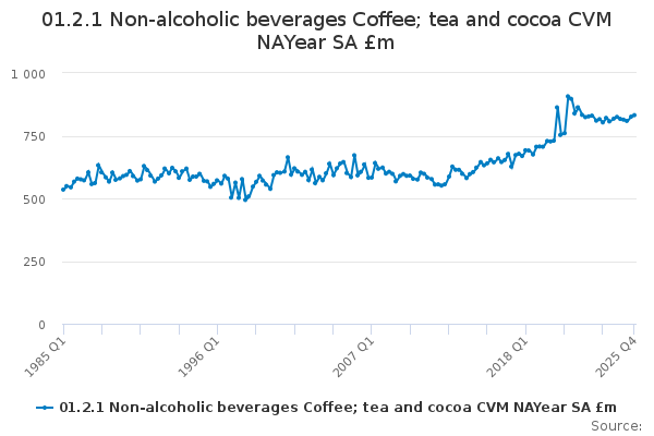Download this time series01.2.1 Non-alcoholic beverages Coffee; tea and cocoa CVM NAYear SA £m