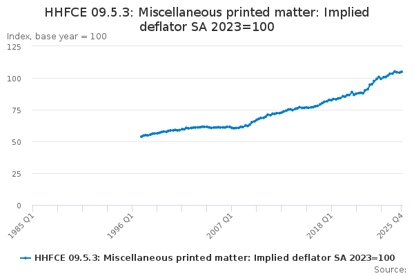 Download this time seriesHHFCE 09.5.3: Miscellaneous printed matter: Implied deflator SA 2023=100