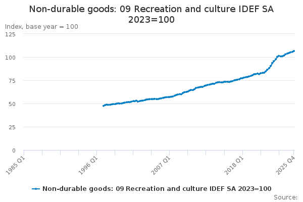 Download this time seriesNon-durable goods: 09 Recreation and culture IDEF SA 2023=100