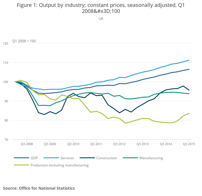The preliminary estimate of Gross Domestic Product (GDP) indicated that the growth of the UK economy slowed from 0.7% in Q2 2015 to 0.5% in Q3 2015, and from 2.4% to 2.3% compared to the same quarter a year earlier. While the output of the services industries is estimated to be 11.1% above its pre-downturn peak, the manufacturing industry remains 6.3% below this yardstick. Over the recovery, there has also been a shift in the composition of services output away from financial services toward other services.