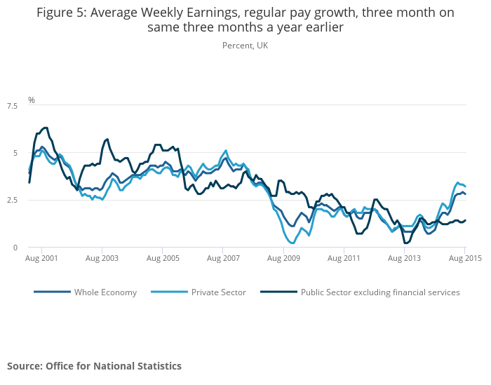 Average weekly regular pay grew by 2.8% in the three months to August 2015, continuing the recovery which started in earnest in mid-2014. The growth rate of real earnings has also picked up since the beginning of 2014, albeit from well below pre-downturn levels