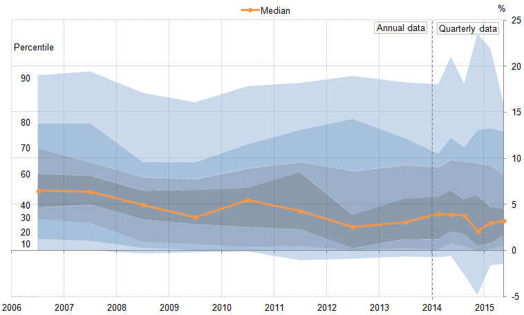 Figure 13: Distribution of rates of return on direct investment, non seasonally adjusted