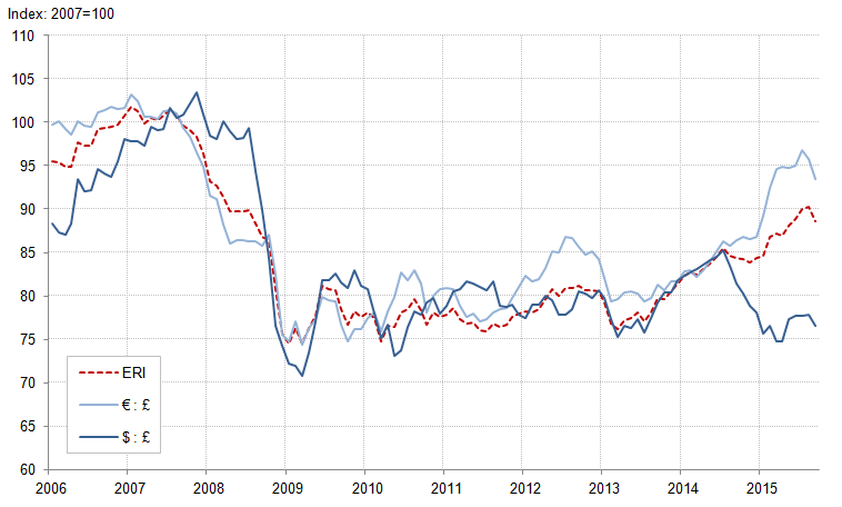 .png (33.2 kB)However, even after breaking down the ‘other’ component into its constituent parts, there remains a relatively large, downwards contribution from the remaining products of this group, which is indicative of a broad weakening of price pressure among a range of products. Taking Figure 10 as a whole, 15 of the 56 classes represented experienced falling prices in September 2014, compared with 23 in September 2015, and the group’s cumulative contribution to the CPI has fallen from 0.6 percentage points to 0.2 percentage points over this period. Some of these movements – and in particular recent changes in some goods prices – are partly explained by movements in the exchange rate, through its impact on import prices. Sterling has appreciated by 5% on a trade weighted basis during the first nine months of 2015 – reflecting a marked appreciation against the Euro, and a relatively strong depreciation against the US dollar (Figure 11). Others – and in particular prices for products which are not typically imported – are likely to reflect some degree of pass through of lower price pressures from other products.