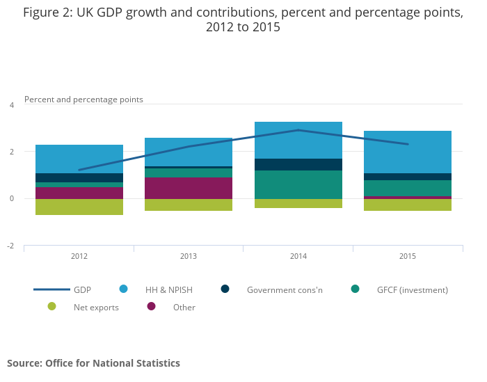 Figure 2: UK GDP growth and contributions, percent and percentage points, 2012 to 2015