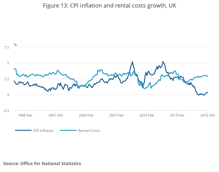 .png (16.0 kB) .xlsx (12.2 kB)While the contributions of several components have been relatively volatile in recent years – in particular, those exposed to changes in the oil price and the value of Sterling – some, largely services products have provided a fairly consistent contribution to the CPI. Figure 13 shows the rate of price change for the aggregate CPI and the rate of rental price change since 1997. While the aggregate CPI has shown relatively large swings in recent years – ranging from more than 5% in 2008 and 2011, to -0.1% in 2015 – the rate of price change for rentals has been more stable. Rental price growth over this period has varied around an average annual rate of 2.7% – falling following the economic slowdowns in the early 2000s and in 2009. As a consequence, rental prices have made a fairly consistent contribution to CPI inflation over this period.
