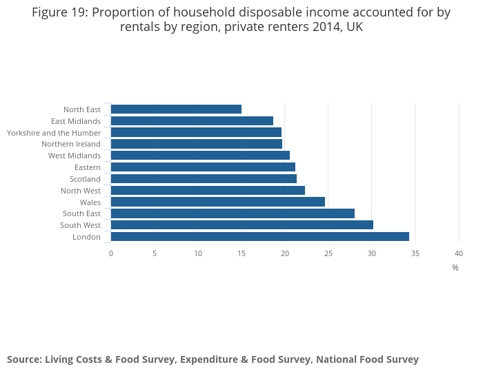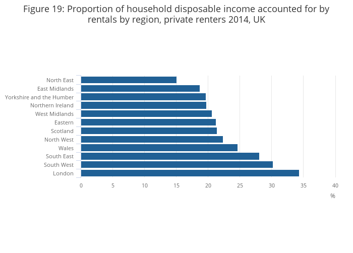 Figure 19: Proportion of household disposable income accounted for by rentals by region, private renters 2014, UK