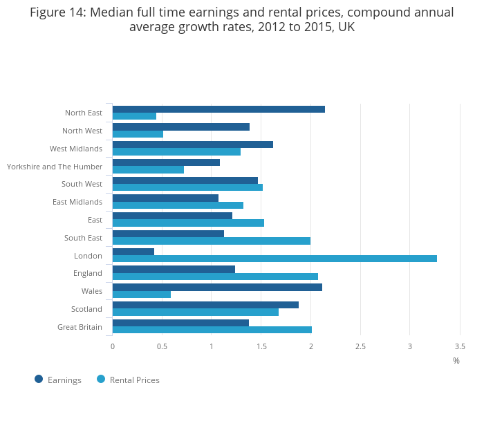 Figure 14: Median full time earnings and rental prices, compound annual average growth rates, 2012 to 2015, UK