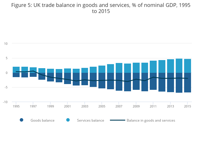Figure 5: UK trade balance in goods and services, % of nominal GDP, 1995 to 2015