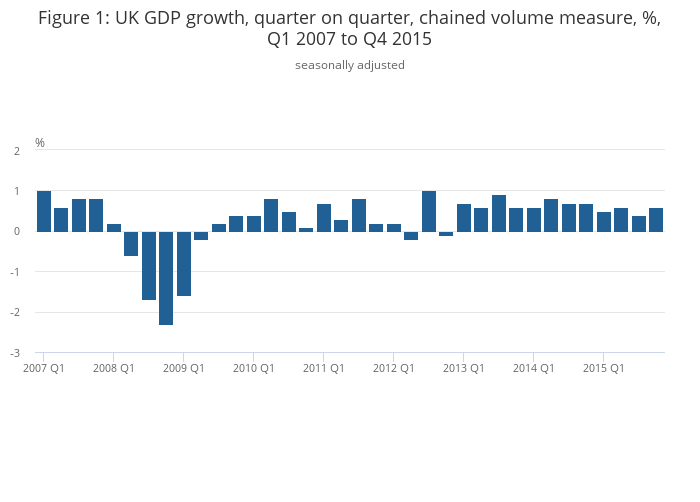 Figure 1: UK GDP growth, quarter on quarter, chained volume measure, %, Q1 2007 to Q4 2015