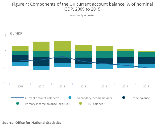 The current account of the balance of payments declined to a record deficit of 5.2% of GDP in 2015, largely as a result of a fall in earnings on UK foreign direct investment (FDI) assets abroad relative to overseas FDI assets in the UK. The exposure of the UK to changes in commodity prices – in particular the oil price – and weaker overseas earnings of some the UK’s largest multinational companies help to explain this recent fall.
