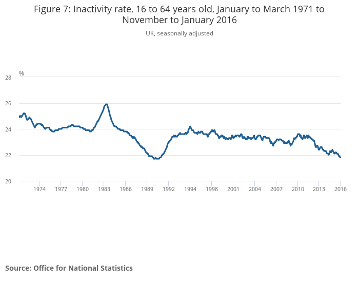 This improvement in the labour market has been accompanied by a marked reduction in the inactivity rate; defined as the proportion of individuals aged 16 to 64, who are not looking for a job or are not available for work (Figure 7). After a period of relatively stable inactivity rates through the 1990s and 2000s, the inactivity rate among those aged 16 to 64 has been on a downward trend since 2011. In the three months to January 2016, the inactivity rate among those aged 16 to 64 of 21.8% was close to a record low.