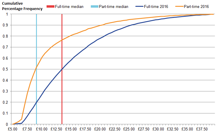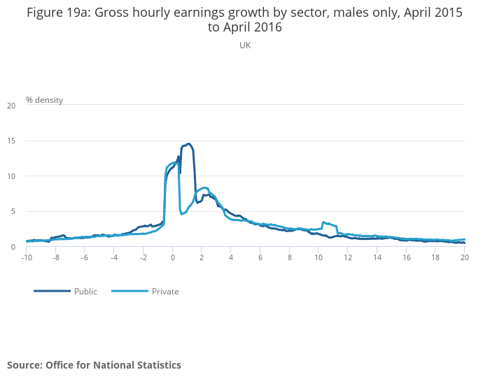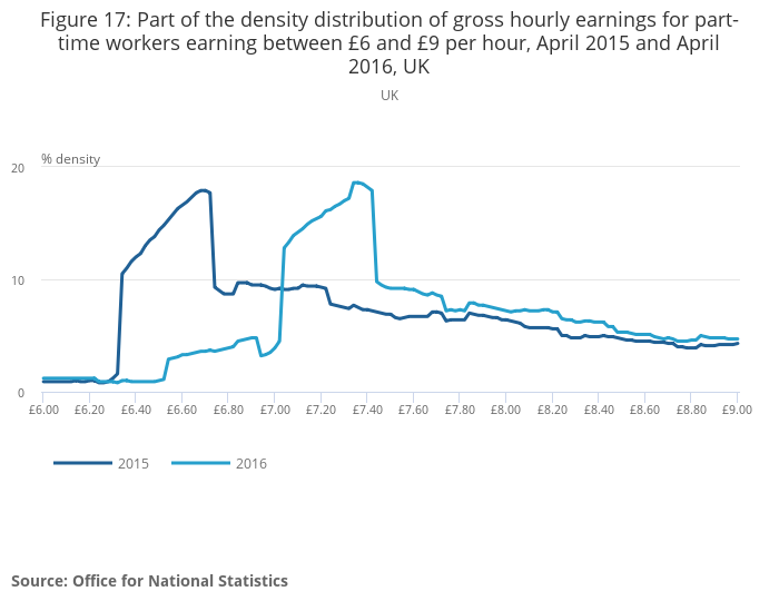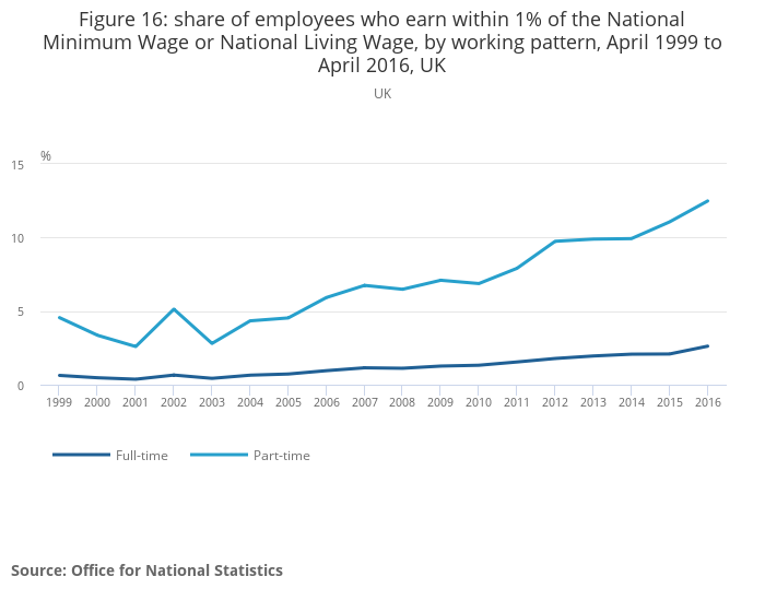 The proportion of part-time workers that have earnings that are within 1% of the National Minimum Wage or National Living Wage is considerably higher than full-time workers. There is a higher share of women in the private sector concentrated around National Living Wage pay rates of £7.20 per hour than women in the public sector. The industries which had the highest share of workers who experienced a pay freeze in 2016 included specialised construction activities and some areas of manufacturing.