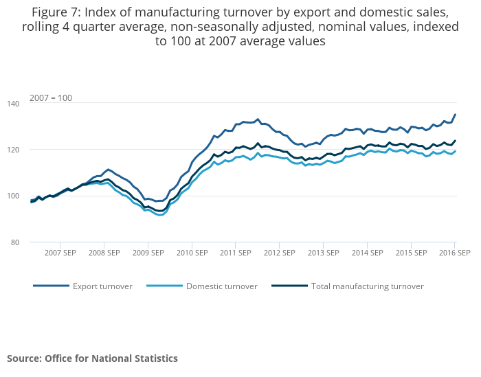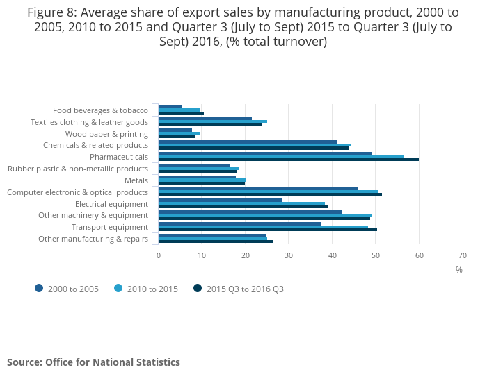 Industries that have increased their share by the largest amount include pharmaceuticals – which now attribute 60% turnover to exports – as well as computer and electrical products. There are no signs that this has changed in the most recent data, following the depreciation in sterling.