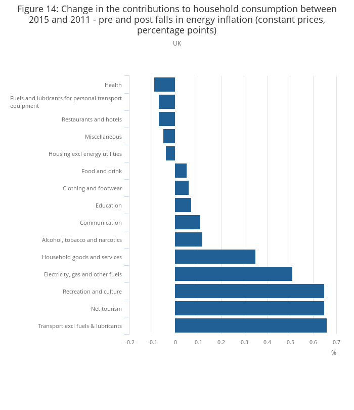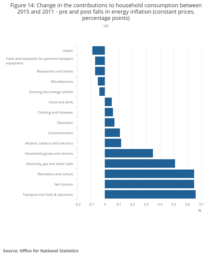 Figure 14: Change in the contributions to household consumption between 2015 and 2011 - pre and post falls in energy inflation (constant prices, percentage points)