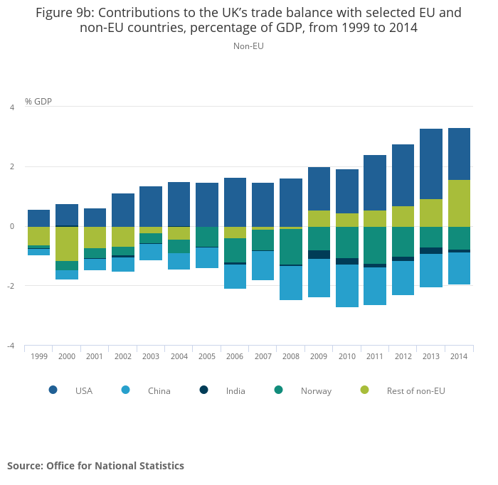 Figure 9b: Contributions to the UK’s trade balance with selected EU and non-EU countries, percentage of GDP, from 1999 to 2014