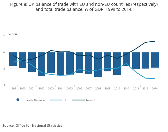Figure 8: UK balance of trade with EU and non-EU countries (respectively) and total trade balance, % of GDP, 1999 to 2014.