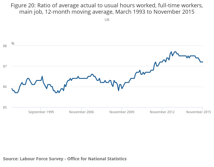 Figure 20: Ratio of average actual to usual hours worked, full-time workers, main job, 12-month moving average, March 1993 to November 2015