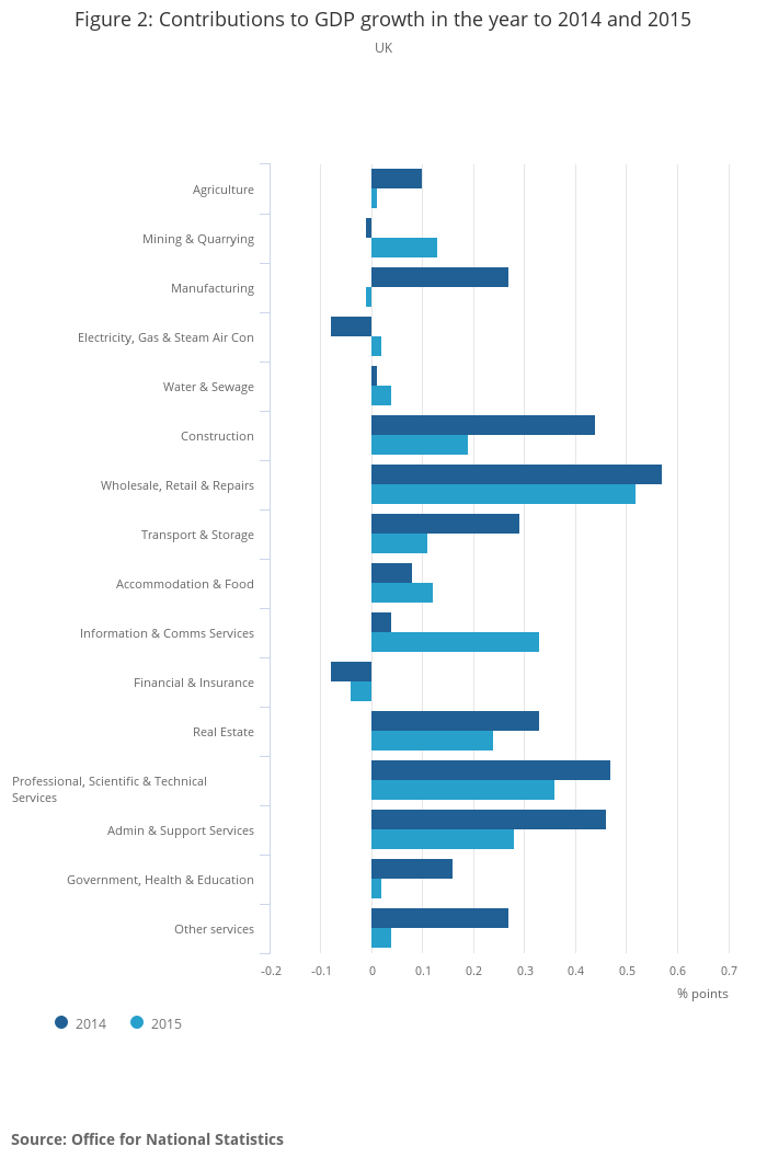 Image .csv .xlsThe services industries were the primary drivers of GVA growth, both in Q4 2015 and in 2015 as a whole. Figure 2 shows how different sub-industries contributed to GVA growth in the final quarter of 2015 and how this compares with 2015 as a whole. The three industries which made the largest contribution to growth in 2015 were wholesale, retail & repair services, professional, scientific & technical services, and information & communication services, which together accounted for 1.2 percentage points of the 2.2% growth of GVA over this period. Financial & insurance services and manufacturing detracted from growth, together reducing GVA by 0.1 percentage point.