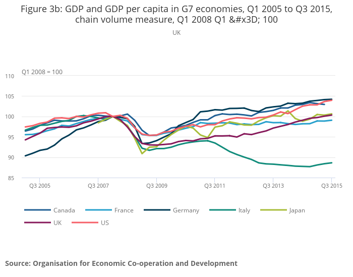 Download this chart Figure 3b: GDP and GDP per capita in G7 economies, Q1 2005 to Q3 2015, chain volume measure, Q1 2008 Q1 = 100