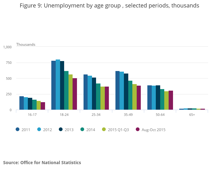 Figure 9: Unemployment by age group , selected periods, thousands