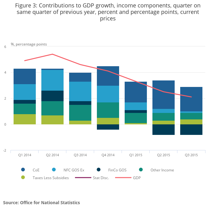 GDP continued to grow in Q3 2015, as it has been doing for the past eleven quarters. Although growth was 0.4% quarter on quarter in Q3 2015, and averaged 0.5% across the previous three quarters of 2015, this represents something of an easing in GDP growth compared to 2013 and 2014. Aggregate output is now 6.1% above its pre-downturn level. Broader measures of economic well-being also increased in Q3 2015, notably GDP per head and Real Net National Disposable Income per head.