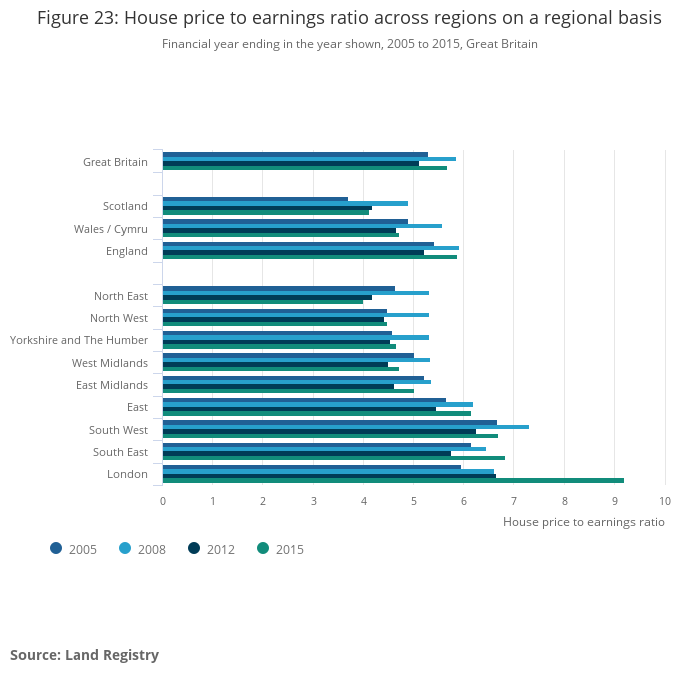 Examination of the ratio of mean house prices to mean annual earnings also provides an insight into the relative affordability of housing across the regions of Great Britain throughout the period. During the 2004 to 2005 financial year, Scotland had the lowest ratio of house prices to annual earnings, where house prices were 3.7 times greater than the average salary. In comparison, the South West had the highest ratio of house prices to annual salary, where house prices were 6.7 times higher than annual earnings. By the 2007 to 2008 financial year, Scotland continued to have the lowest ratio of house prices to earnings, whereas the South West had the highest ratio at 7.3. In the 2011 to 2012 financial year, post-economic downturn, both the North East and Scotland had the lowest ratio, whereas London became the least affordable region where the house prices were 6.7 times higher than average annual earnings. London continued to be the least affordable region in the 2014 to 2015 financial year, in which the house-prices-to-earnings ratio was 9.2. In the North East, the ratio has declined sharply since the economic downturn and stood at 4.0 in 2014 to 2015.