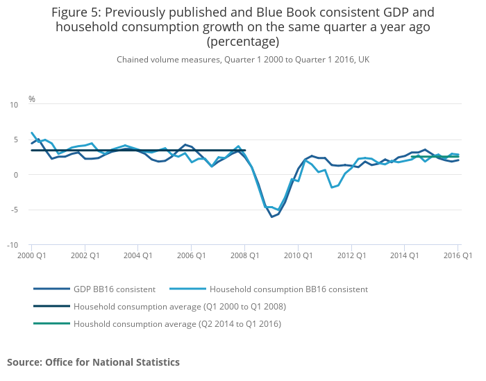 Figure 5 shows Blue Book consistent GDP and household consumption growth. Household consumption accounts for over 60% of GDP, based on the expenditure volume measure. It is therefore an important determinant of GDP as a whole. While there have been revisions to GDP and its components through the implementation of Blue Book 2016 updates – especially as a result of change to the estimation of imputed rentals - these data revisions have not materially changed the profile of household consumption in volume terms and its role in shaping GDP.