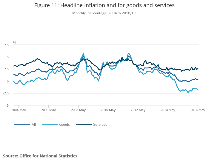 Inflation remains very low at 0.3% in May 2016, but has moved slightly away from the 0.0% average of 2015. Goods inflation continues to be negative and much more variable than services inflation, which has been steady at around 2.5% since mid-2013. This divergence in rate and path partly reflects differences in exposure to international markets and therefore competitive pressures. The low rate of inflation suggests that there is still a reasonable amount of spare capacity in the economy and that there is competition in domestic markets to capture consumer spending, even though household consumption has been growing consistently for some years now. Low inflation also boosts household disposable income and the spending power of earnings.