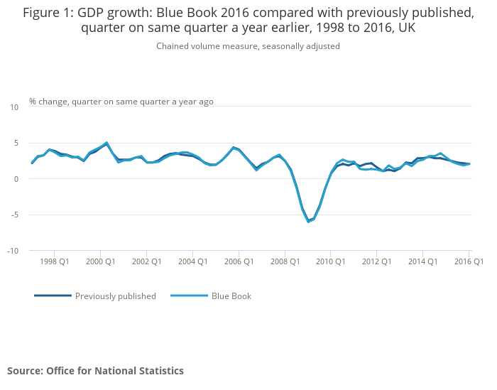 Figure 1: GDP growth: Blue Book 2016 compared with previously published, quarter on same quarter a year earlier, 1998 to 2016, UK