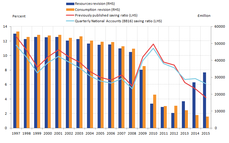 .png (45.3 kB) .xls (759.3 kB)Although a significant proportion of the revisions to household resources and consumption are due to the improved method of estimating the imputed rental of owner occupiers, there are other changes that affect the saving ratio. This includes methodological changes for estimating value added tax (VAT) fraud and improvements to own account construction, which are discussed in the article Detailed Assessment of Changes to Sector and Financial Accounts: 1997 to 2014. In 2014 and 2015 there are much larger upward revisions to resources than consumption. This was partly driven by upward revisions to wages and salaries as a result of the take on of later HM Revenue and Customs pas-as-you-earn (PAYE) data, though this upward revision was partly offset, from 2015 onwards, by an improved method for estimating wages and salaries that generated downward revisions. This was alongside larger revisions to gross operating surplus and smaller revisions to consumption expenditure affected by the imputed rental methodology changes.