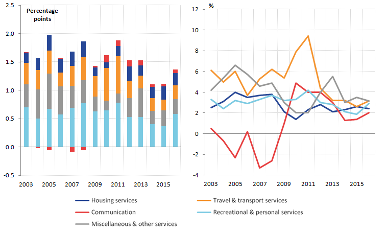 Download this image Figure 13: Services and sub-components, contribution to headline inflation and unweighted price growth